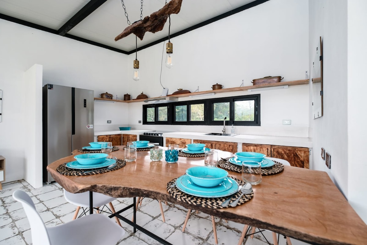 Prenditela con calma in questo alloggio unico e rilassante. La Bambu Cabana è circondata da bambù e offre una vista mozzafiato sul Vulcano Baru. Svegliati per vedere il sole che si riflette sulla montagna, visibile chiaramente attraverso le grandi finestre a tutta altezza. Lavora alla scrivania o rilassati sulle poltrone reclinabili o sulle sedie da balcone all'aperto. Goditi una doccia rinfrescante o un lungo bagno nella grande vasca. La cabina include un angolo cottura ben fornito e una lavatrice-asciugatrice.