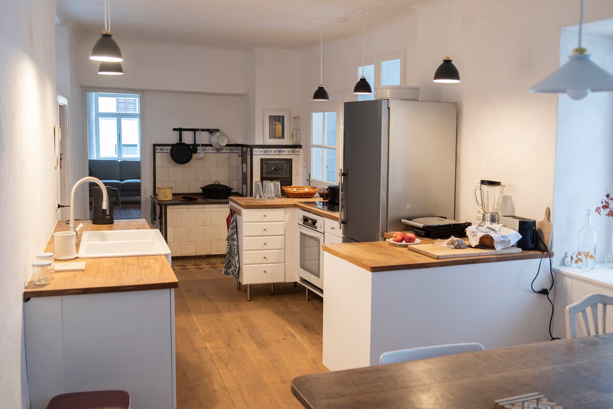 Anche il viaggio è in decelerazione, in auto, in autobus, in treno. L'incantevole paesaggio del Waldviertel, il selvaggiamente romantico Thayatal hanno un effetto rilassante. Tutto nel loft è premuroso, minimalista, ma confortevole. Lascia che la tua mente vaghi guardando fuori dalla finestra verso il giardino. Sul divano, con un libro della biblioteca interna. Prepara il tuo piatto preferito nella cucina vintage completamente attrezzata.