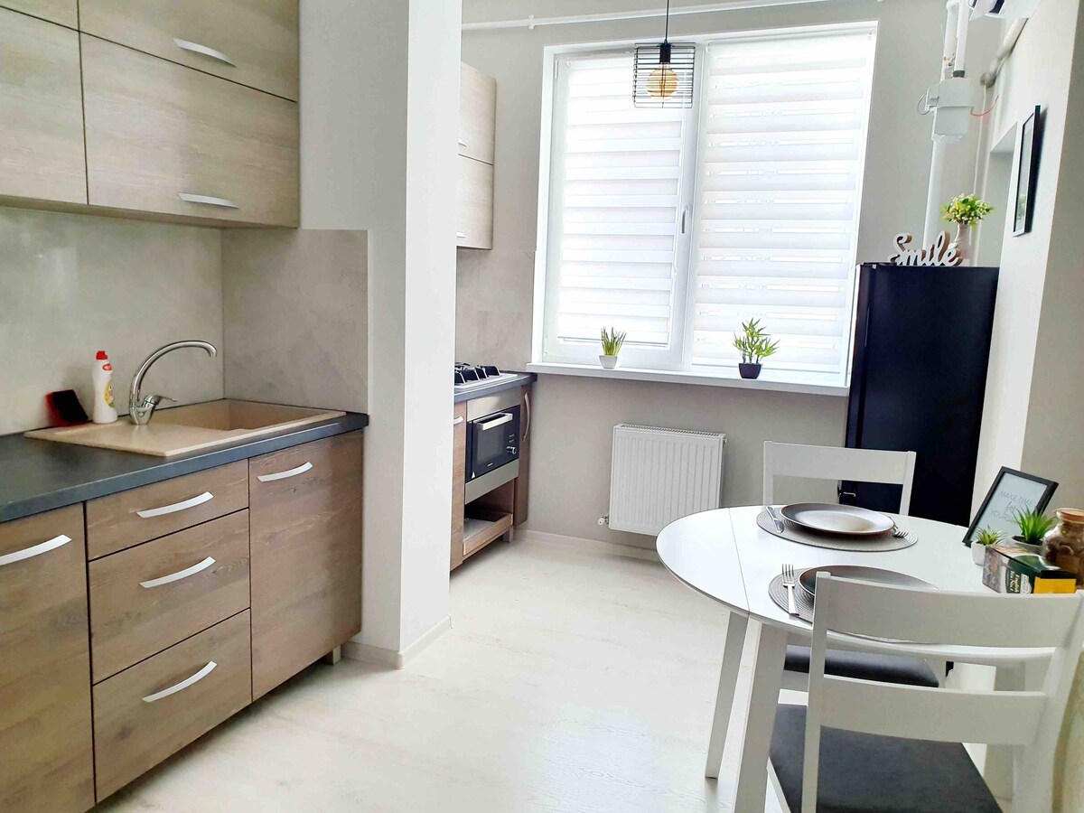 Il nostro accogliente appartamento si trova in una zona verde, a pochi passi dal lago. L'alloggio spazioso offre una camera da letto separata e un accogliente soggiorno, ideale per rilassarsi dopo una giornata intensa. Goditi il caffè del mattino con vista sul parco o passeggia nell'ampia area naturale intorno al lago. Forniamo tutto il necessario per un soggiorno confortevole, tra cui una cucina completamente attrezzata, Wi-Fi gratuito e una posizione comoda vicino al centro. Benvenuti!
