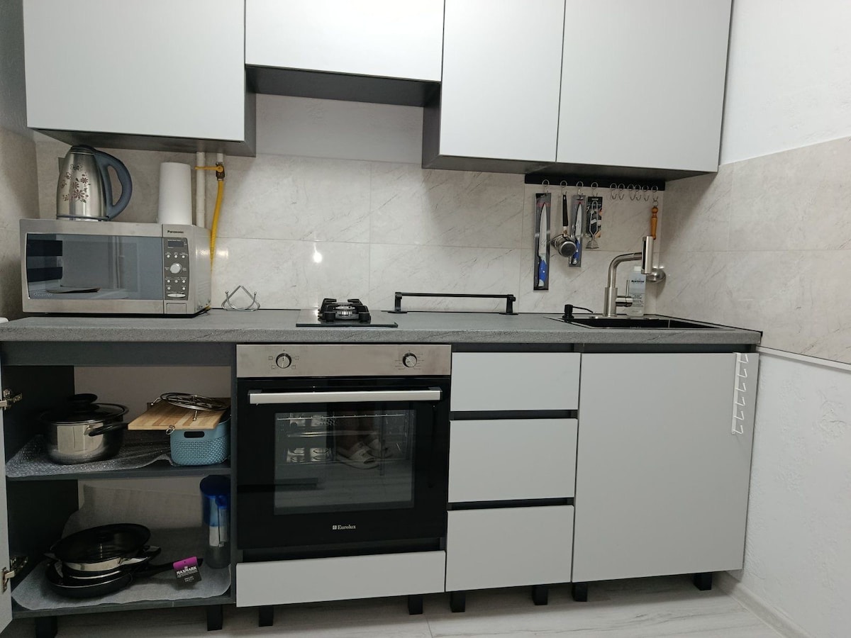Moderno vicino all'aeroporto di Chișinău A soli 20 minuti a piedi dall'aeroporto, questo appartamento tranquillo e moderno è perfetto per i viaggiatori. A 5-10 minuti di distanza troverai un supermercato, una farmacia e un bancomat. Facile accesso ai mezzi pubblici: il filobus 30 si ferma nelle vicinanze e porta al centro città in 20-30 minuti. I taxi dall'aeroporto impiegano solo 5-7 minuti. Ideale per un soggiorno confortevole e conveniente!