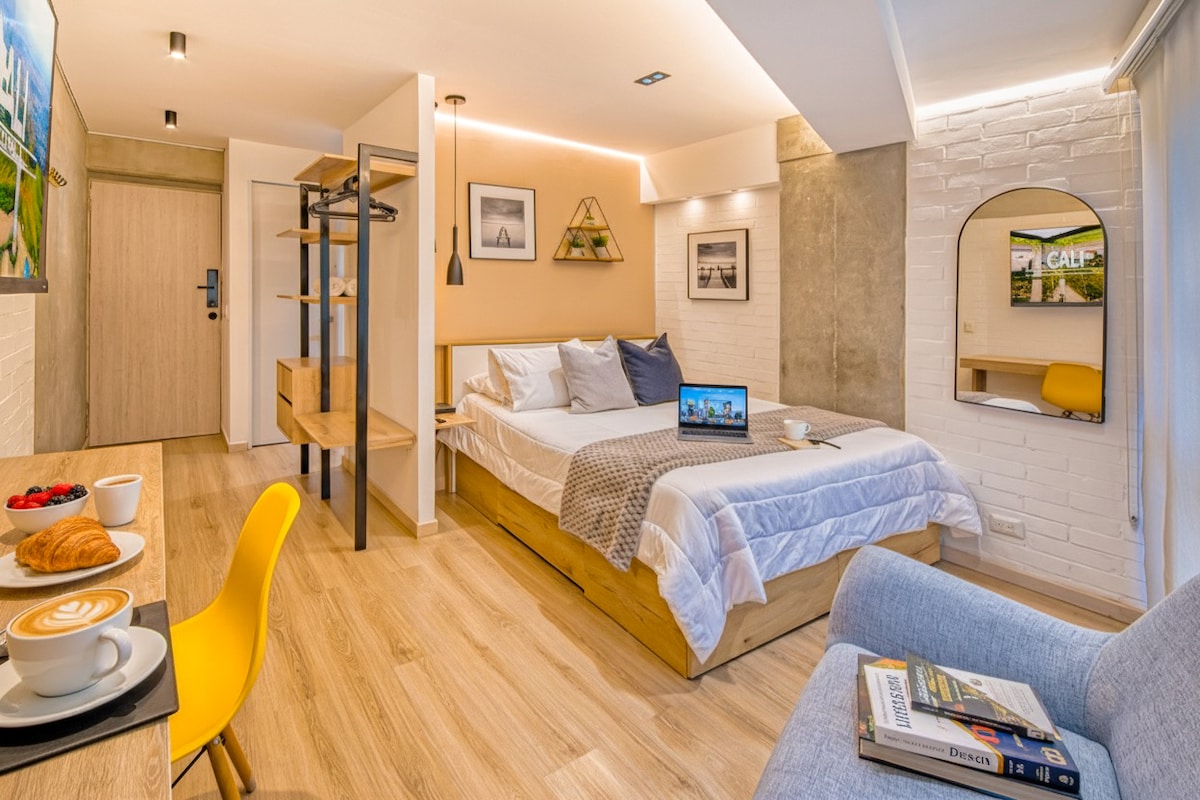 ✨Vive Cali dal 12° piano con viste uniche e brezza fresca. Aparthotel moderno con cucina, salotto, camera e bagno privato. 🛏️Rilassati con aria condizionata, TV da 60", oscuramento e luci. 🏊♀️Accesso alla piscina, alla terrazza a 360°, al coworking, alla palestra, alla sauna e alla vasca all'aperto. 🚗L'edificio offre parcheggi comunitari in base all'ordine di prenotazione. 🌃Vicino a ristoranti, centri commerciali e attrazioni turistiche.