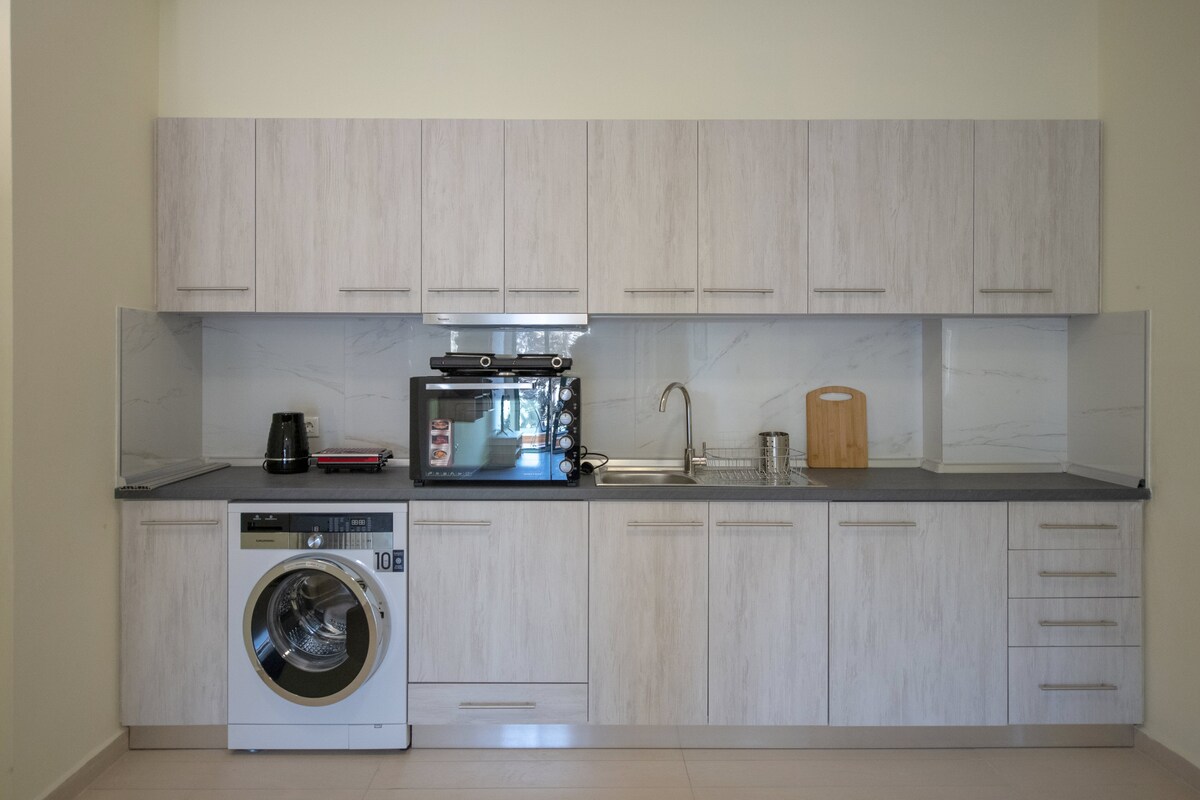 Questo elegante e confortevole appartamento con 2 camere da letto si trova vicino al centro storico (350 metri). È composto da un soggiorno (con aria condizionata), 2 camere da letto (con aria condizionata), una con letto matrimoniale e l'altra con 2 letti singoli, una cucina, un bagno, 2 piccoli balconi, una porta blindata e il wifi. L'ingresso dell'edificio ha pochi gradini e un piccolo ascensore. A pochi passi troverai: Una varietà di negozi tra cui un supermercato e una farmacia, il centro - 20 minuti/1,6 km, la spiaggia di Zefiros - 24 minuti/2,0 km, la spiaggia di Elli - 27 minuti/2,2 km.