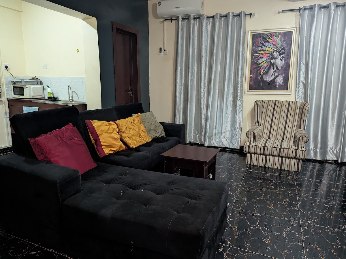Un appartamento con una camera da letto, un bagno e un soggiorno, che combina design in legno afrocentrici e moderni contemporanei. Spa interna (con sauna, bagno turco e sale massaggi), ristorante interno, palestra, caffetteria, piscina all'aperto con pergolato a bordo piscina, elettricità 24 ore su 24, 7 giorni su 7, sicurezza e telecamere a circuito chiuso. È ideale per soggiorni lunghi e brevi, con un minimo di tre giorni, e si trova a cinque minuti di auto dall'aeroporto internazionale e a dodici minuti di auto dall'aeroporto nazionale. Trasferimento aeroportuale disponibile