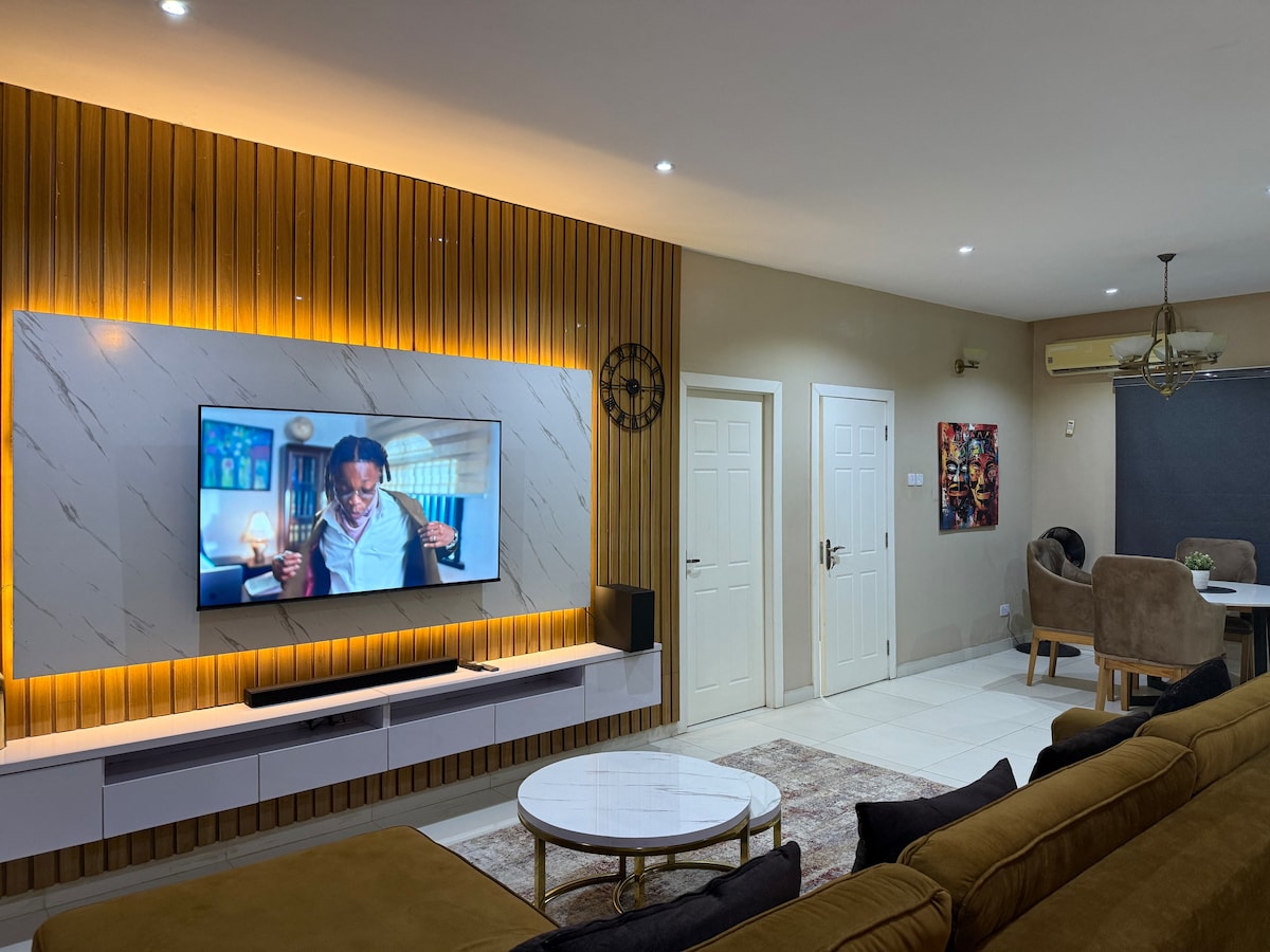Our 2-bedroom getaway is perfect for couples, friends, families, tourists, and remote workers. Located in a quiet, secure estate at Aare Bodija, just 2–5 mins from key spots in Ibadan. 🎥 Private Cinema 🌅 Outdoor dining area 🔌 24/7 power supply 🛡️ 24/7 security in a gated estate 🚀 180 MB/s Starlink Wi-Fi ❄️ AC in all rooms and living areas 🛏️ Plush Bedding 🎮 PS5 Console 📺 Smart TV in the living room 🍳 Fully Equipped Kitchen 🧼 Washing machine, iron & ironing board 🚗 Free parking space