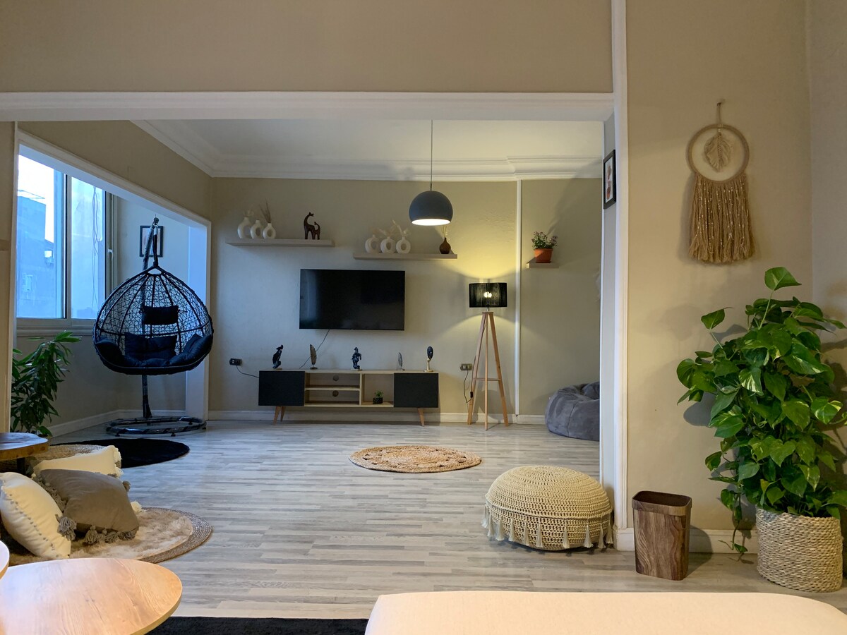 Ti diamo il benvenuto nel tuo accogliente rifugio nel centro del Cairo Perfettamente incastonato nel cuore della città, questo accogliente rifugio con tre camere da letto e due bagni può ospitare comodamente fino a 7 persone con cinque letti disposti con cura. Che siate una famiglia in cerca di spazio e sicurezza, o un gruppo di amici in cerca di un luogo accogliente e centrale, questa casa è stata progettata per offrire comfort, connessione e comodità. Rilassati. Sistemati. Senti il battito del Cairo da uno spazio che sembra tuo.