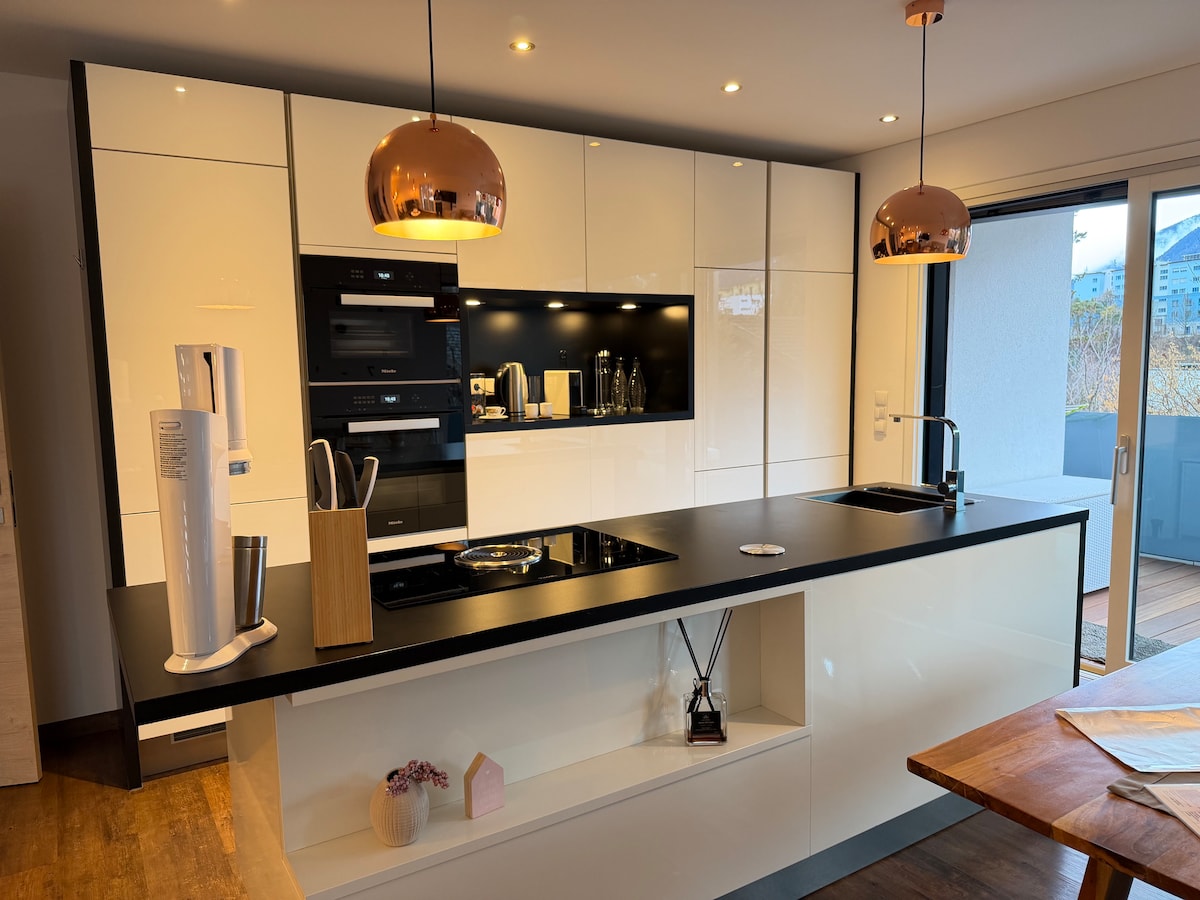 Elegante attico in stile alpino moderno sull'altopiano di Seefeld. L'accogliente e tranquillo appartamento all'ultimo piano è molto confortevole per un massimo di 4 persone. Dispone di un luminoso soggiorno-pranzo con una moderna cucina completamente attrezzata, due camere da letto matrimoniali, due bagni, riscaldamento a pavimento, Wi-Fi gratuito e una terrazza privata molto ampia. Da lì puoi goderti la vista mozzafiato sulle montagne e sulla valle dell'Inn, sia in estate che in inverno.