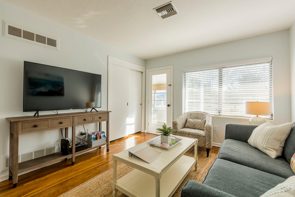A un isolato dalla baia di Sarasota, appartamento completamente ristrutturato e arredato con un tocco di stile Art déco di Miami. L'unità è di poco più di 28 metri quadrati e dispone di cucina completa, un bagno con doccia, comodo letto matrimoniale, diversi sgabelli/sedie, TV a schermo piatto, wifi, parcheggio privato, sei porte USB per una facile ricarica e zona salotto all'aperto sulla veranda anteriore. A 5 minuti dal centro o dall'aeroporto SRQ, a 15 minuti da Lido Beach e a 25 minuti da Siesta Beach, con facile accesso a University Parkway o Fruitville Rd.