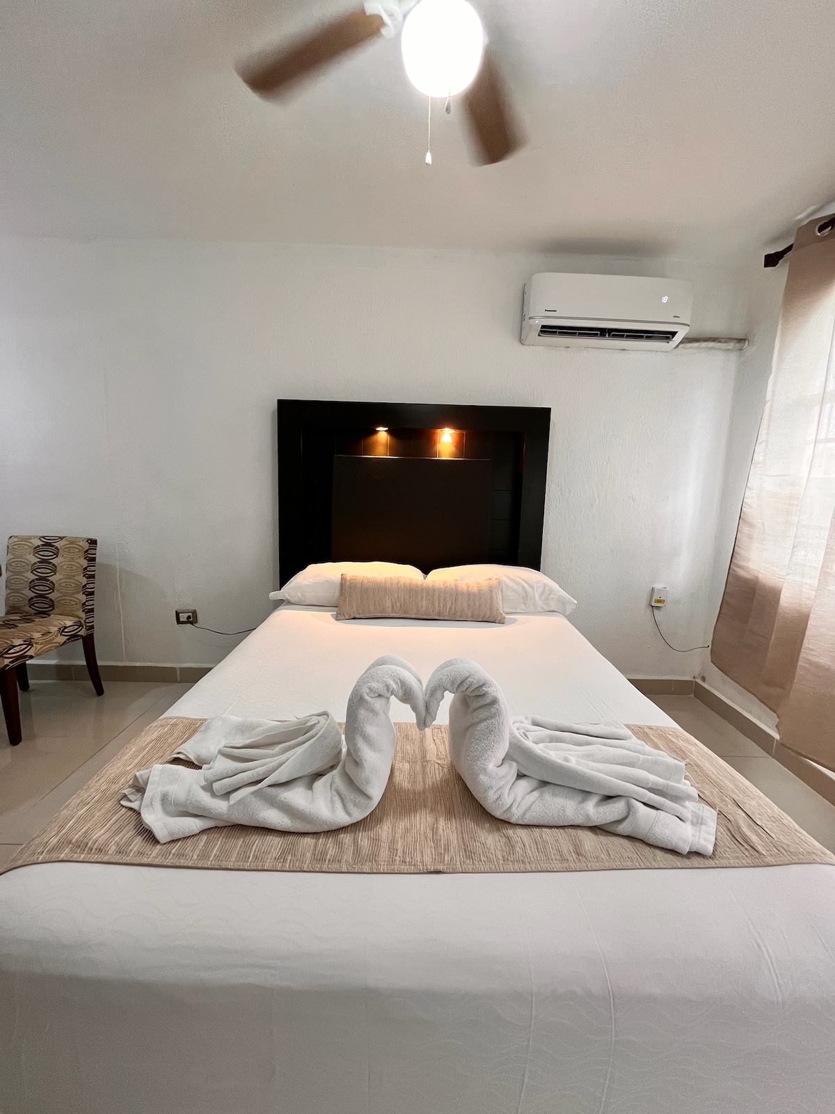 Un piccolo alloggio accogliente, perfetto per 2 persone, situato nel cuore della Zona Hotelera di Cancún. A 5 minuti a piedi dalla bellissima spiaggia di Ballena, vicino all'Hard Rock Hotel, al Secrets the Vine e al Sandos Hotel. Monolocale in un'oasi privata, situato in un complesso residenziale privato di 5 ville. Avrai un ingresso indipendente, senza scale da salire, due piscine direttamente di fronte allo studio, spazi verdi e palapa. Un letto a due piazze (2 posti letto)