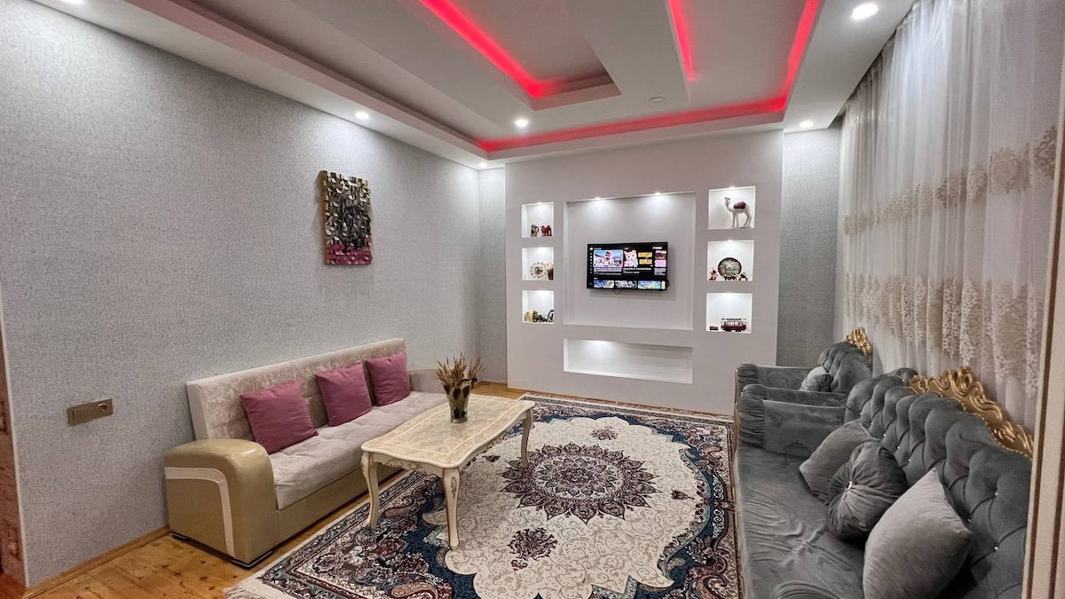 Una vacanza tranquilla nel cuore della natura, con la splendida vista sulle montagne di Gabala, ma comodamente situata vicino al centro città! Questa incantevole casa può ospitare comodamente fino a 6 persone e offre privacy completa grazie a un ingresso privato e un ampio cortile. Goditi la colazione o la cena all'aria aperta, grazie alla zona pranzo all'aperto. È la fuga perfetta dai rumori della città, che ti permette di riconnetterti con la natura. Ideale sia per famiglie che per gruppi di amici