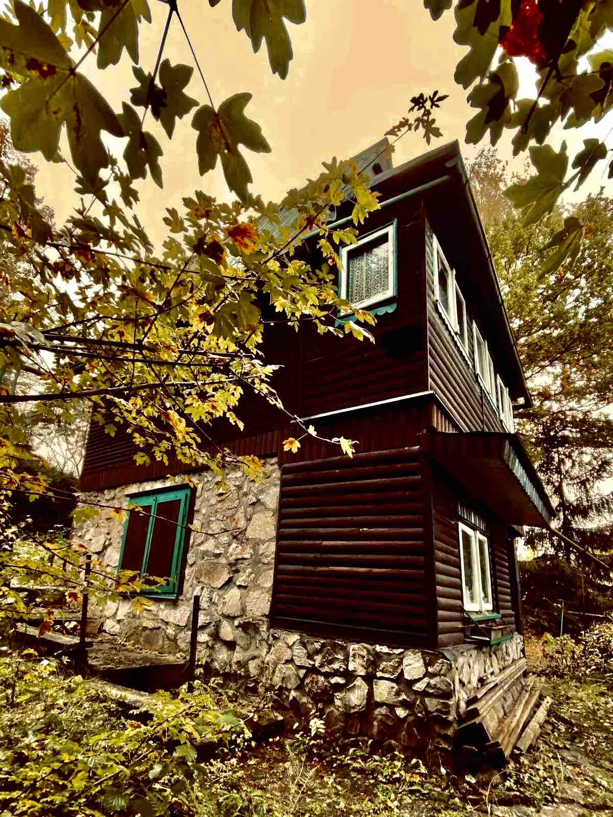 Cottage nel bosco circondato da un prato, fiume e stagno