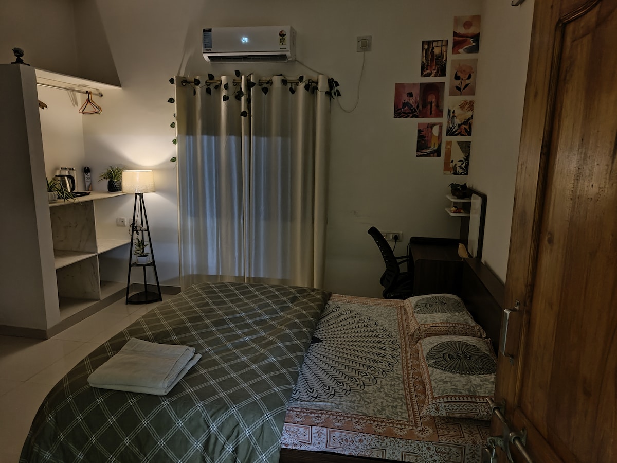 Beautifully decorated place for 2. You get- 1 spacious room (AC) - queen size bed + orthopedic mattress 1 attached toilet with comod 1 private washroom with indian toilet. 1 study table with comfortable chair 1 closet. Open terrace with plants. Not included: Geyser (you can ask for immersion rod) Wifi (Good network here so mobile internet will have no issues) Inverter (Not much power cuts in the area so generally it isn't a problem) No Lift (You have to use stairs for 2bd Floor)