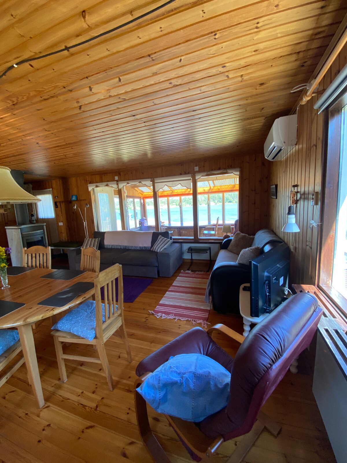 La casa dispone di soggiorno con cucina, due camere da letto e bagno con lavatrice, 55 m2. Dal soggiorno/cucina e dal balcone si ha una bella vista sulla baia di Kalmar, ci sono 75 metri fino al molo e la sauna a legna si trova nel cortile dietro la serra. L'alloggio è adatto per 4-6 persone in quanto ci sono un letto di 160 cm e uno di 140 cm nelle camere da letto e due letti di 80 cm nel soggiorno. A 5 km di distanza in bicicletta dal centro di Mariehamn