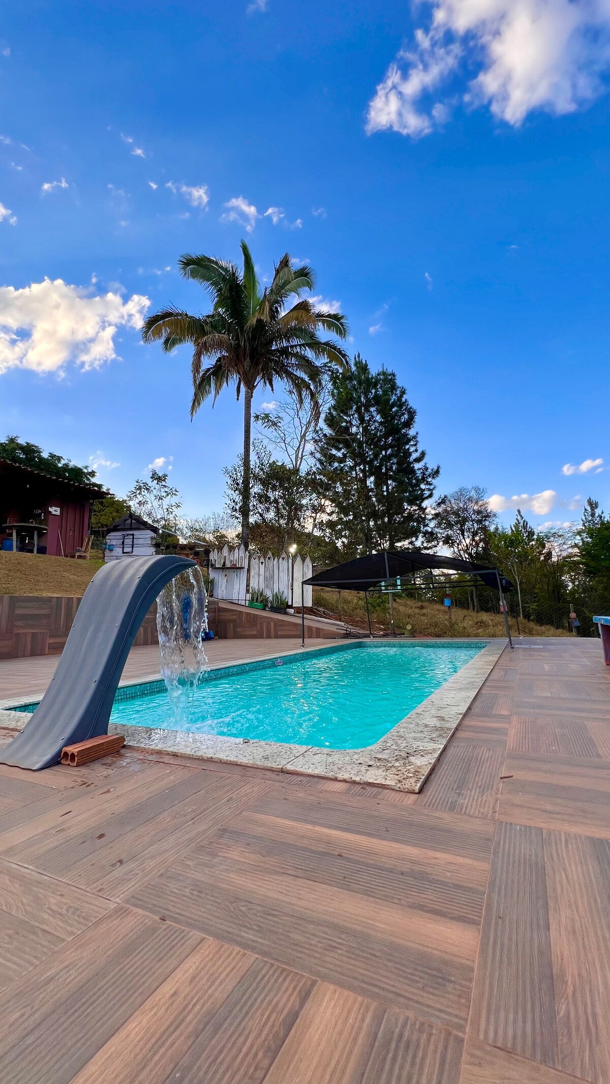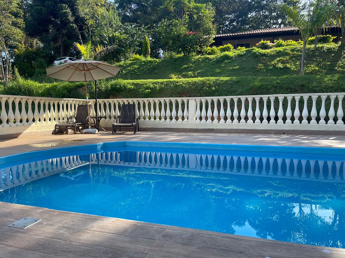 Ambiente piacevole, arioso e ben illuminato, con 1000 mq. Ottimo per rilassarsi e distendersi con la famiglia e gli amici. Ben arricchito da diversi alberi da frutto e uccelli nativi. Dispone di una piscina profonda 1 metro con cascata, in un'area recintata per una maggiore sicurezza. Parco giochi e altalena appena rinnovati. Campo erboso con 2 porte e rete per pallavolo/peteca. Divano grande e retrattile. Letto king-size in una delle camere. Ampio balcone intorno a tutto il sito. Ben posizionato, vicino ai supermercati.
