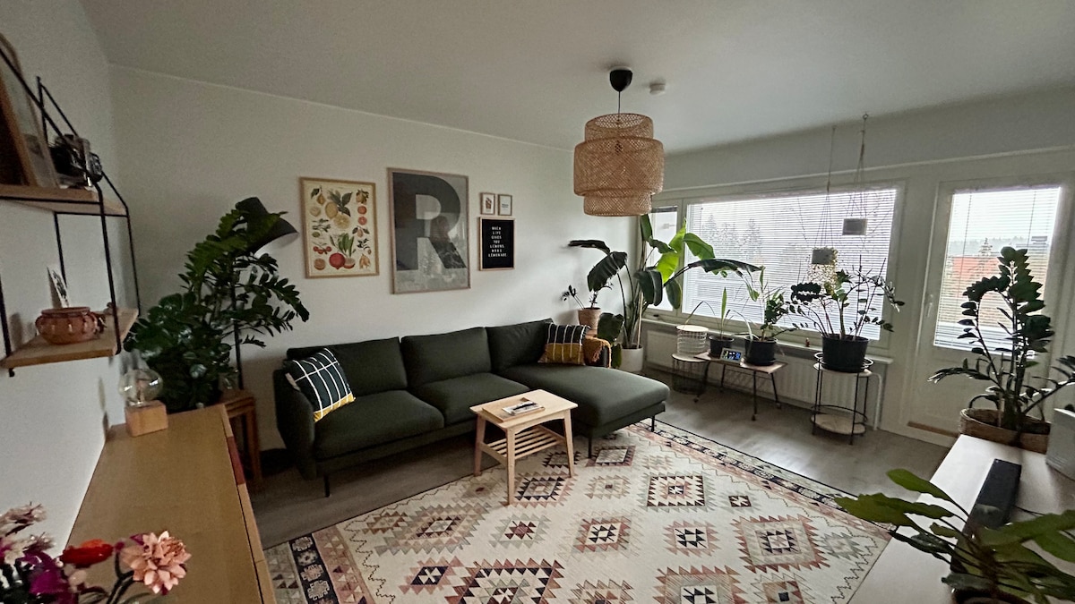 55m2 apartment and balccony. Close to services. Bus stop/free parking in front. Next to a grocery, pizzeria and padel/tennis/badminton and swimming center. Only a few km/miles to city center and Sibelius Hall. TV in the living room and bedroom, both with Netflix/YouTube etc. Wireless wifi throughout the apartment. Washer + laundry detergent available. Accommodation includes: towels, bathroom accessories and bed linen, coffee/tea/cacao.