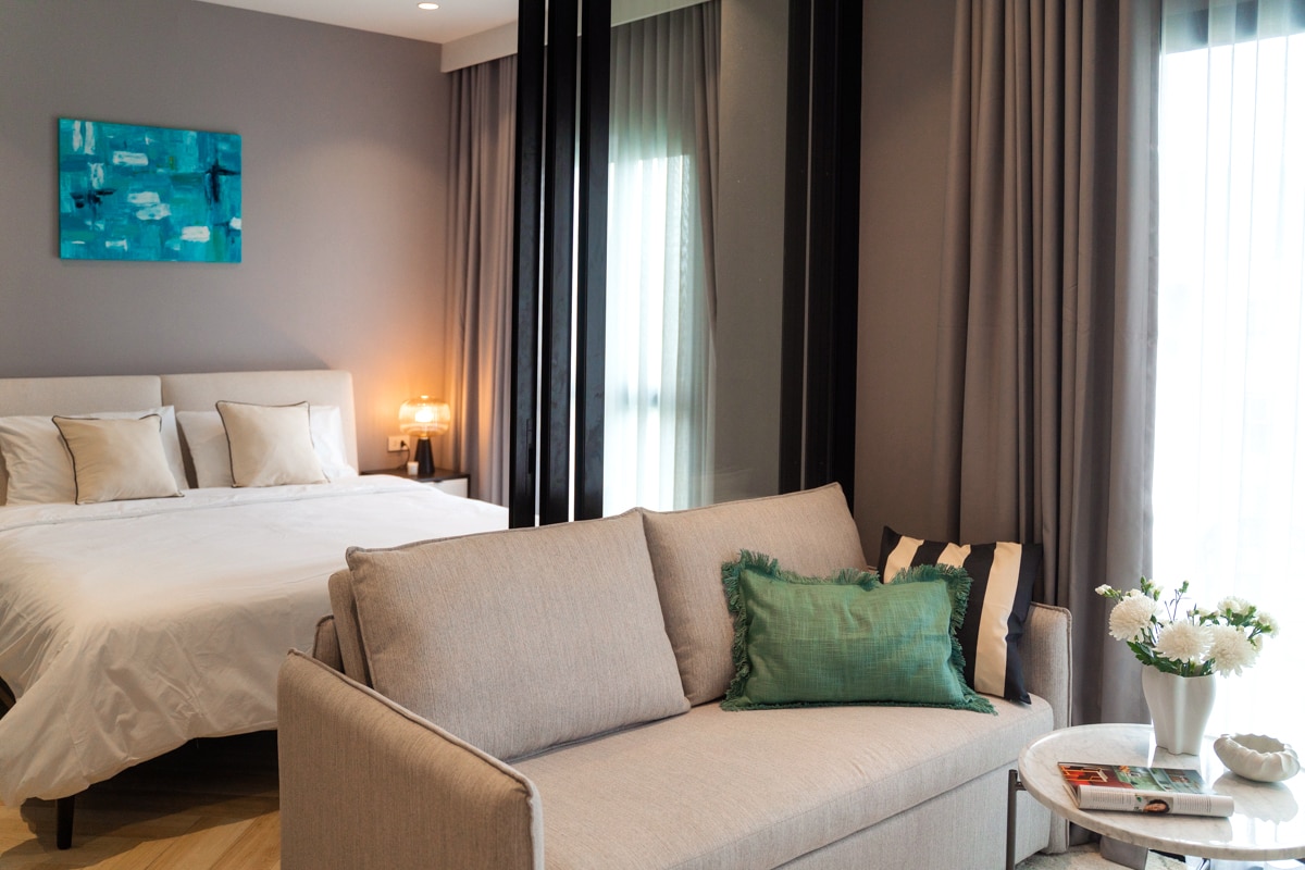 A 28 sqm one-bedroom suite, perfect for 1-2 guests, featuring: -Fully equipped kitchen -Private bathroom -Small balcony -Smart TV -Private high-speed WiFi -Air-conditioner -Washing machine -Queen Size bed -2 swimming pools -Gym -Co-working space -Outdoor shower area - No smoking in the room. - If you have a car or motorcycle, please inform us of the type of vehicle in advance.