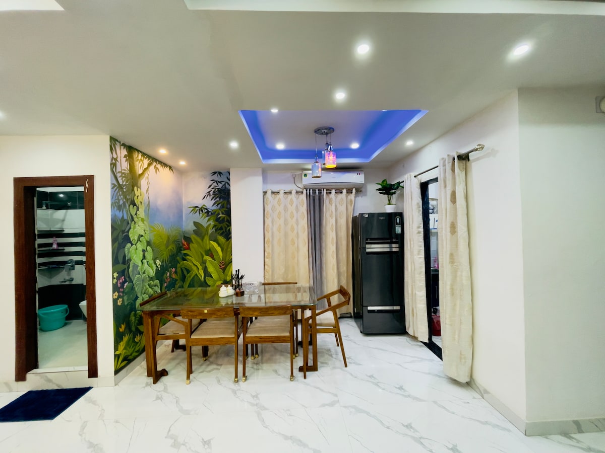 Un luminoso e arioso open space perfetto per rilassarsi e connettersi, con grandi finestre con luce naturale, una confortevole zona giorno, una cucina compatta e carina e una zona pranzo con 1 letto king size. 3 balconi con un bagno annesso ideale per gruppi o viaggiatori solitari. Flipkart a pochi minuti, nello stesso edificio al piano di sotto. 1 min dalla spesa locale e dalla vendita al dettaglio. A 1 minuto dal Bhetapara Hockey Stadium. A 5 minuti dallo stadio Sarusojai. A 5 minuti dall'ospedale. A 10 minuti da Khanapara. A 35 minuti da Kamakhya Mandir/Aeroporto/Stazione ferroviaria.