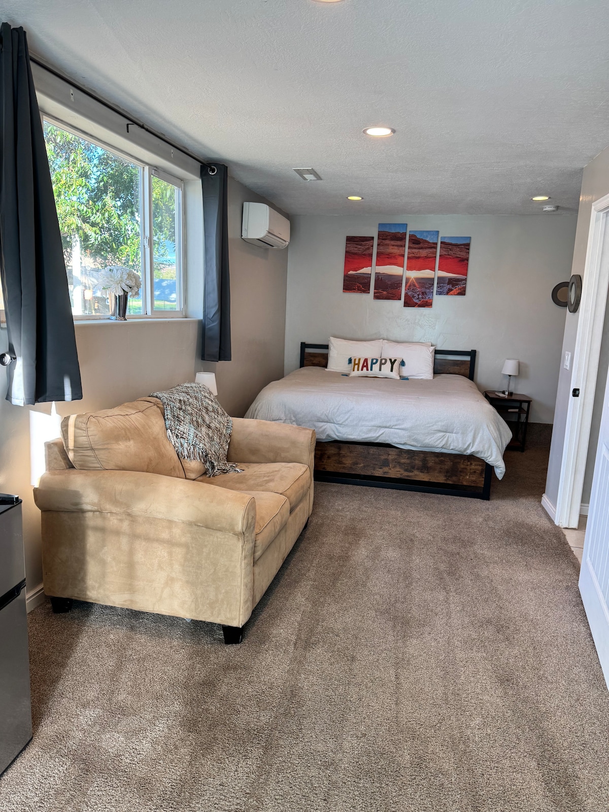 La nostra suite privata si trova al piano inferiore della nostra casa nell'incantevole città di Kanab. Hai un ingresso privato accanto al tuo parcheggio. C'è un portico per rilassarsi dopo le avventure, per ammirare il sole che risplende sulle scogliere di roccia rossa o per gustare un caffè/tè/cioccolata al mattino. Sarai vicino a sentieri escursionistici, ristoranti e al Jacob Hamblin City Park. Il posto auto privato può ospitare 2 auto; è disponibile un parcheggio aggiuntivo per barche, UTV e così via. Le biciclette possono entrare.