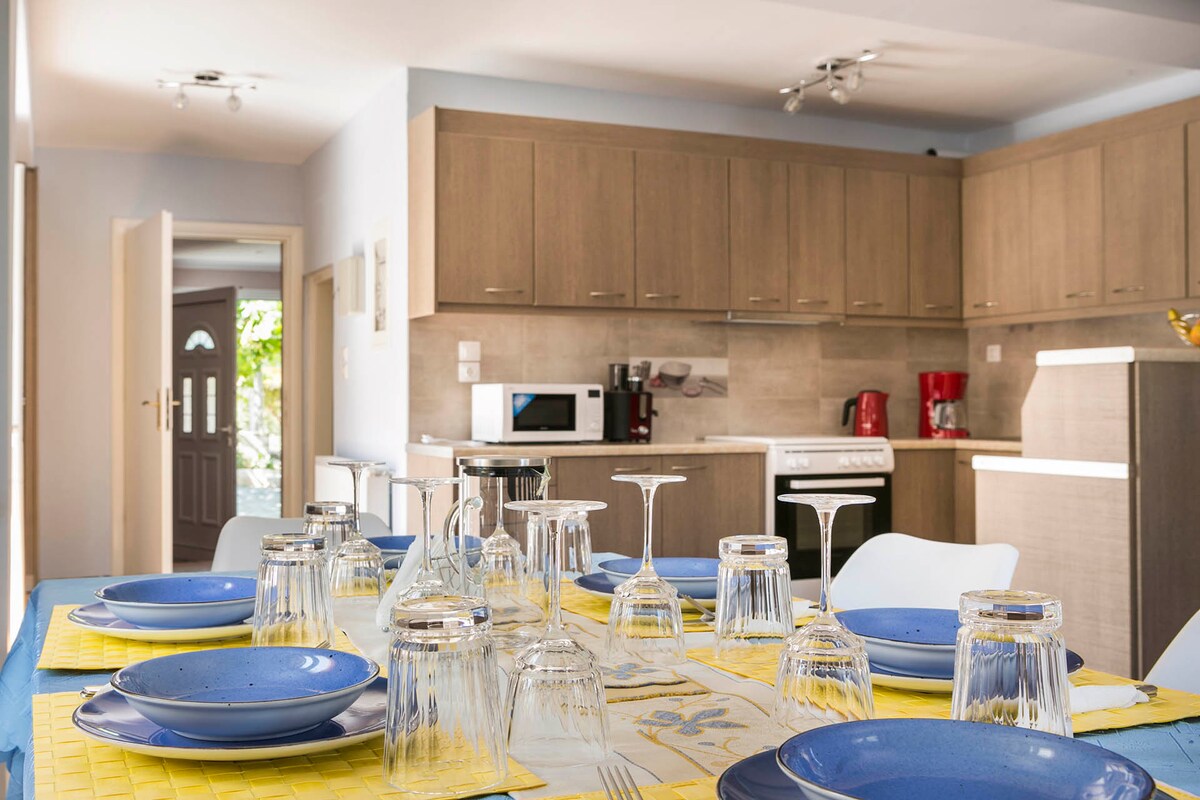Rilassati su una terrazza in collina con vista sul mare, mentre la fresca brezza marina soffia tutto il giorno. La sera, l'aria porta con sé il profumo del gelsomino e del caprifoglio. L'atmosfera serena continua all'interno con piante in vaso, eleganti arredi a muro e decorazioni di buon gusto in tenui tonalità naturali. L'illuminazione e altri dettagli completano l'atmosfera serena. La casa ha un ambiente arioso e rilassato, che combina l'architettura moderna con elementi tradizionali. Puoi godere di materiali di alta qualità, soffitti alti, luce giocosa e biancheria fine. È disponibile un altoparlante Bluetooth per ascoltare la tua musica preferita dal computer. Le camere da letto dispongono di bagno privato. È presente una cucina completamente attrezzata con lavastoviglie e macchina per caffè espresso. È disponibile un barbecue in pietra. Per i mesi più freddi, c'è una stufa a pellet e coperte elettriche che donano una sensazione di calore. Avrai accesso al nostro orto, ovviamente in base alla stagione. Sono disponibile in qualsiasi momento per qualsiasi assistenza richiesta. Sebbene l'isola di Itaca sia piccola, ha molti tesori nascosti. È un piacere aiutarti a esplorarli. Su richiesta, è possibile organizzare qualsiasi servizio relativo alle vacanze, come noleggi o prenotazioni. L'isola di Ithaki è un luogo tranquillo e piuttosto intimo, con molti tesori da scoprire. La casa si trova nel villaggio di Ag. Saranta, un insediamento tradizionale nella zona nord, che si affaccia sulla baia di Afales. La spiaggia vicina con acqua incredibile è a 5 minuti in auto. Il villaggio di Stavros, con tutti i servizi, e il villaggio di pescatori di Frikes si trovano entrambi a 1,5 chilometri di distanza. Purtroppo, non ci sono mezzi pubblici a Itaca. Noleggiare un'auto è altamente consigliato L'accesso a Itaca avviene tramite Cefalonia, Patrasso, Astakos e, nei mesi estivi, anche da Lefkada.