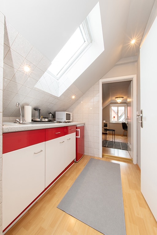 Appartamento mansardato con cucina e bagno, zona tranquilla (zona residenziale) e centrale (4 minuti per l'autostrada/strada statale). - 1 km: Basilica di San Lorenzo e Hildegardisplatz (mercato settimanale mer/sab, mercato contadino ven) - 400m: due fermate degli autobus (linea diretta stazione centrale degli autobus) - 1 km: inizio della zona pedonale che porta fino al Forum Allgäu - 200m: Diversi percorsi a piedi lungo il Rottach e l'Iller - 700m: Clinica Algovia - 800m: negozi (Edeka, farmacia, Norma, ecc.)