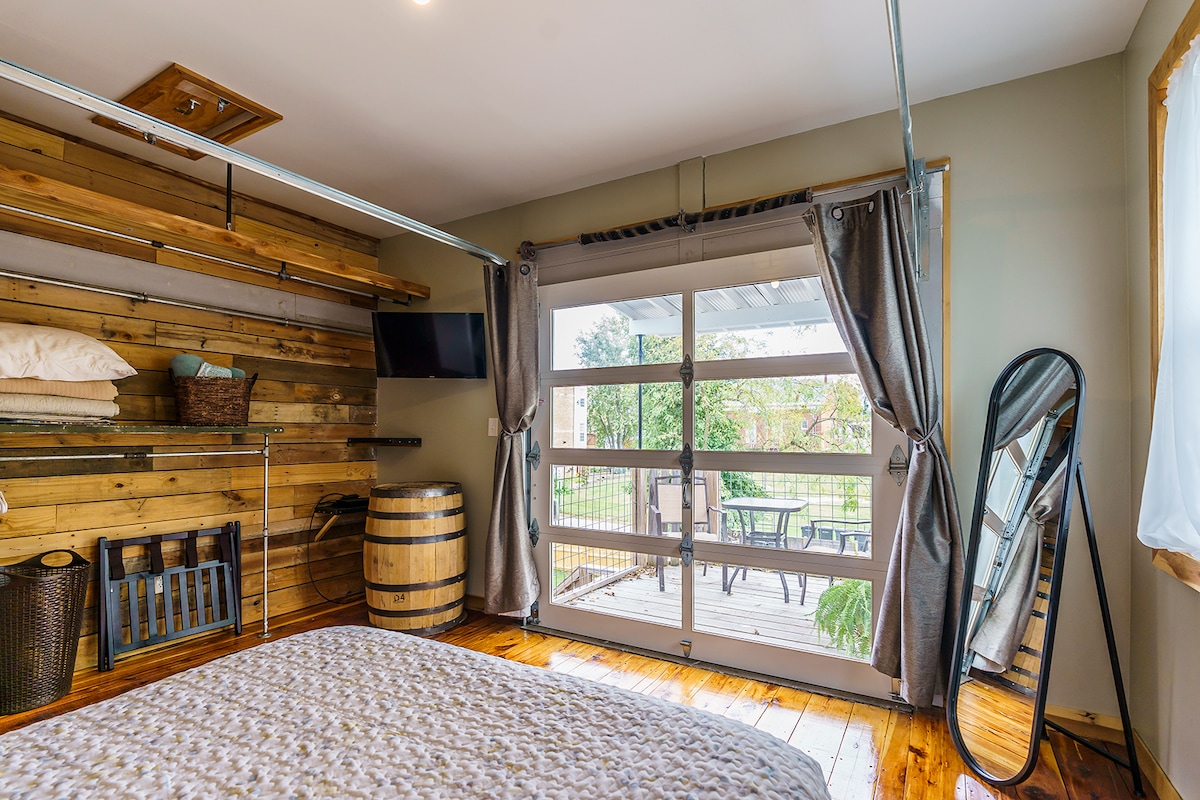 Di recente, abbiamo ricevuto segnalazioni di truffe su Airbnb! Prenota con noi o con qualcun altro che ha una storia! Il Bourbon Trail La Buffalo Springs Distilling Company fu fondata nel 1868. È stato chiuso e i suoi magazzini sono stati svuotati negli anni '70. Questo edificio è una delle ultime strutture rimaste sul sito. Questo edificio storico era l'ufficio principale e la portineria per i visitatori della distilleria, quindi possiamo offrire una camera da letto matrimoniale grazie alle dimensioni della struttura.