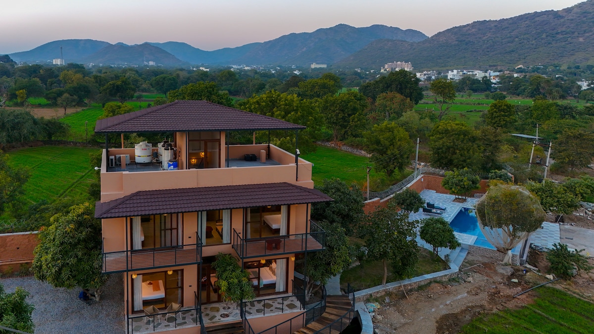 Luxury Farmhouse Retreat near Udaipur | Private Pool & Scenic Views Escape to a serene luxury farmhouse near Udaipur, surrounded by lush greenery and mountain views. Perfect for families, couples, and groups, it offers a private pool, spacious lawns, cozy bedrooms, and modern amenities. Enjoy bonfire nights, home-style meals on request, and a peaceful retreat just 20 minutes from the city. Ideal for relaxing getaways, celebrations, and nature lovers. Highlights: