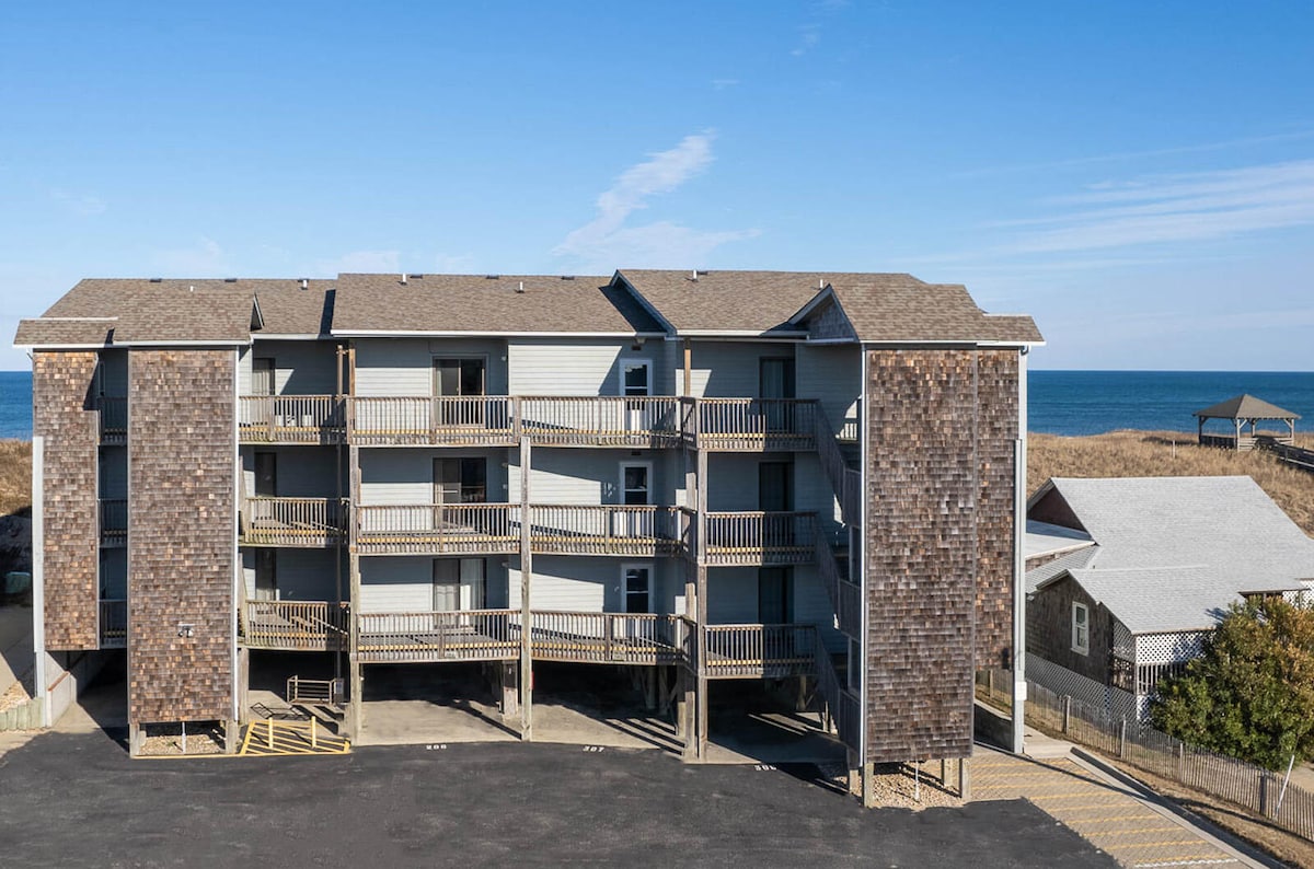 OCEANFRONT, appartamento al 2° piano nel cuore di Duck, in North Carolina, a pochi minuti dalla spiaggia, dai negozi, dai ristoranti e dalle piste ciclabili pubbliche di questa incantevole cittadina. Nuovi pavimenti, elettrodomestici, cucina completamente attrezzata e biancheria da letto confortevole completano questo rifugio per le vacanze! I servizi includono una piscina in comune, una terrazza in cima alla duna e una passerella in comune fino alla spiaggia. Zona giorno confortevole e spaziosa per 5 persone. Ampia terrazza 10x14, ideale per godersi il caffè mattutino in relax. Tennis, pickleball/basket e parco giochi per bambini.