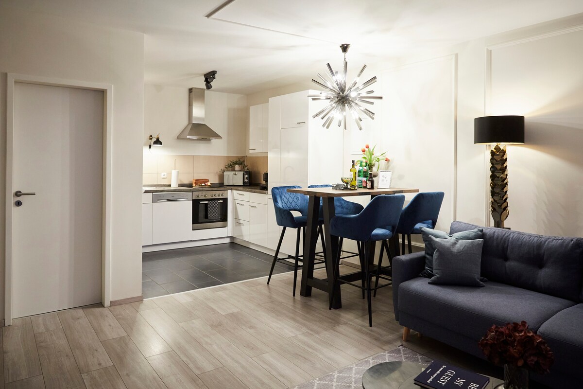Questo moderno appartamento offre 43–47 m² di spazio progettato con cura, con due camere da letto: una con letto matrimoniale e l'altra con due letti singoli. Include anche un bagno, una confortevole zona giorno e pranzo e una cucina completamente attrezzata per la tua comodità. Capienza massima: 6 persone (divano letto matrimoniale per 2 persone) Per i soggiorni di almeno 7 notti, il servizio di pulizia settimanale è incluso. È possibile prenotare servizi di pulizia aggiuntivi a un costo aggiuntivo. Biancheria da letto e asciugamani inclusi.