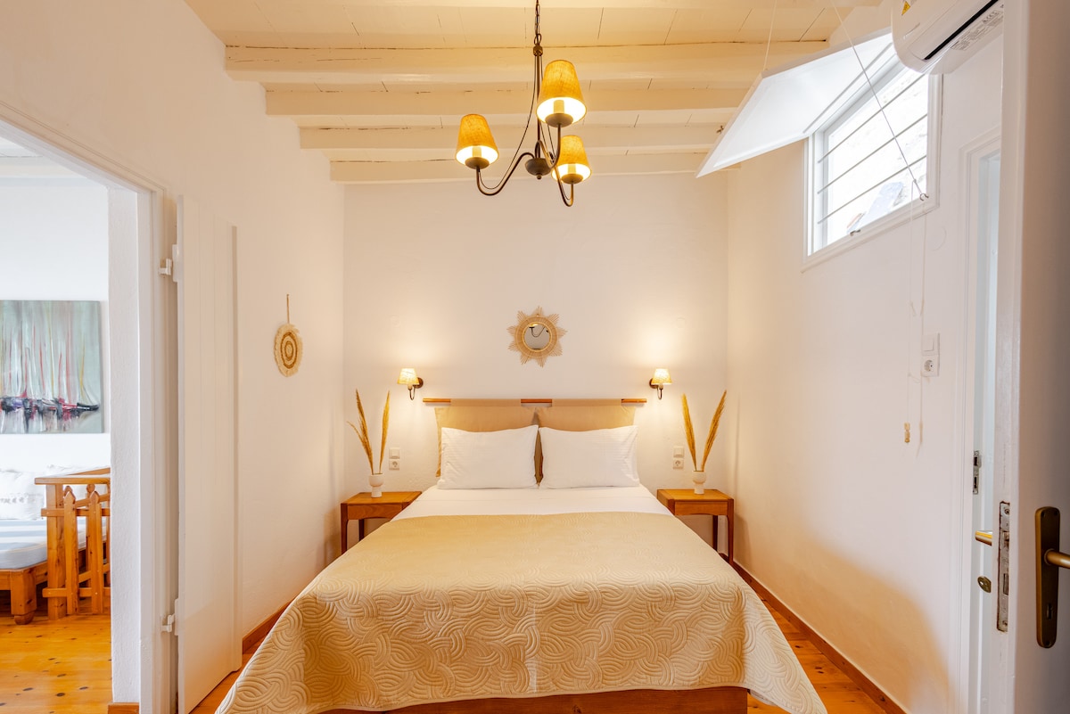 Appartamento colonico privato con soffitti alti con camera da letto e bagno. Angolo cucina speciale, preparazione colazione e piatti freddi. 2 balconi (40m2 in totale), con vista panoramica sul porto di fronte e sul mare di Sarakiniko dietro (il paesaggio lunare è a soli 15 minuti a piedi). Distanze: 4 minuti dal porto e 7 dall'aeroporto in auto, Plaka: 5 km, Pollonia: 7 km, Fyriplaka-Tsigrado in 15 minuti. Giardino paesaggistico di recente, ambiente naturale con privacy e tranquillità.