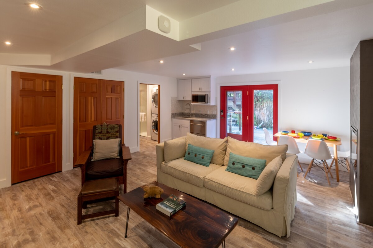 Experience stylish comfort at this centrally located Arcata retreat. Walk to downtown, CP Humboldt, or the redwood forest—or enjoy hillside views and sunsets from the property. Redwood Park, with its stunning trails, is only 2 minutes away. Highlights: -Private entrance/patio -Full kitchen -Washer & dryer -Dedicated workspace -King bed -Full futon/living room Note: 100% smoke-free: indoors and out. We have a Ring camera by the driveway for safety and peace of mind. It records outdoors only.