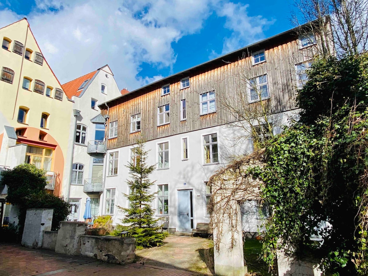 Questo attico si trova in uno degli angoli più belli del centro storico della città anseatica di Stralsund (patrimonio mondiale dell'UNESCO). Si estende sui due piani superiori, appena sotto il tetto di tegole rosse di una casa costruita intorno al 1760 su fondamenta del 1300. L'appartamento soleggiato si trova a due isolati dal porto e dall'Oceaneum a est e dal municipio/piazza del vecchio mercato a ovest. Questa maisonette si trova nel centro storico di Stralsund.