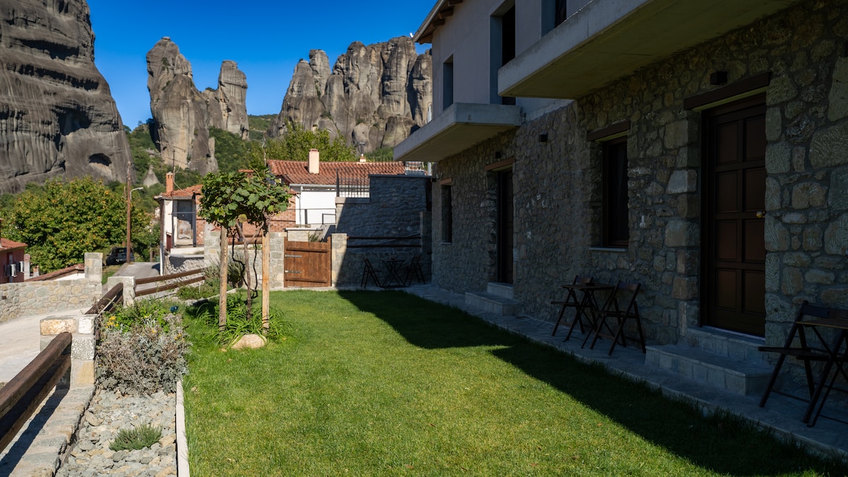 Appartamento indipendente di circa 55 m² in una residenza di lusso in pietra ai piedi delle rocce di Meteora. Arredata in stile tradizionale e completamente attrezzata. Dispone di due camere matrimoniali, un bagno e un soggiorno con cucina. Dispone di una terrazza con vista sulle rocce di Meteora e di un parcheggio gratuito. È facilmente raggiungibile, a soli 2 km dai monasteri di Meteora, a 2 km da Kalambaka e a 300 m da piazza Kastraki.