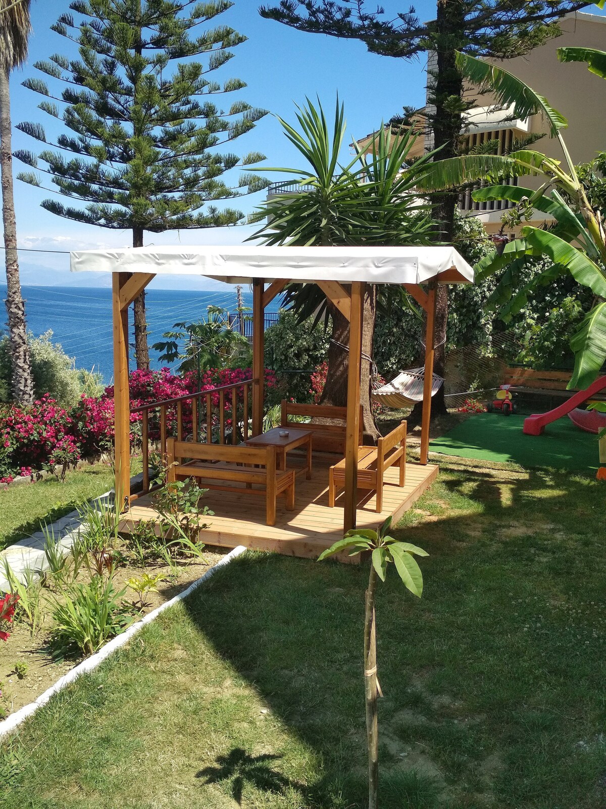 L'appartamento situato in un quartiere tranquillo nel tradizionale villaggio balneare di Benitses si trova a 12 km a sud di Corfù e a circa 60 m dalla spiaggia. Offre un accesso immediato a una varietà di ristoranti locali, negozi di souvenir,mini market. La fermata dell'autobus che porta alla città di Corfù dista solo 50 metri. Offre un parcheggio privato e una bella vista sulla montagna;ha un grazioso cortile ombreggiato e una cucina completamente attrezzata con utensili da cucina,pentole, frigo, lavatrice,A/C,aspirapolvere,asciugacapelli, ferro da stiro.