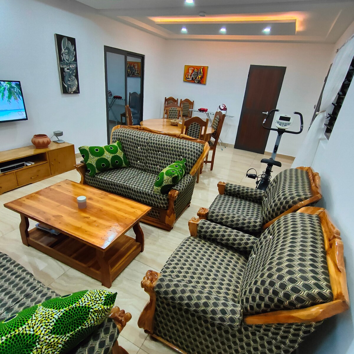 Graziosa villa situata in una zona tranquilla e boscosa di Kpalimé, a 5 minuti dal centro della città e vicino al grande mercato del Castello. È composta da: 2 camere da letto con 2 bagni interni Un ampio soggiorno con 2 divani/letti, cucina aperta e attrezzata. Un WC per gli ospiti con locale lavanderia 2 terrazze esterne all'interno di un ampio giardino fiorito. Capacità di accoglienza 6 adulti e 1 bambino (lettino a sbarre disponibile) Per ulteriori informazioni non esitate a contattarmi tramite messaggio.