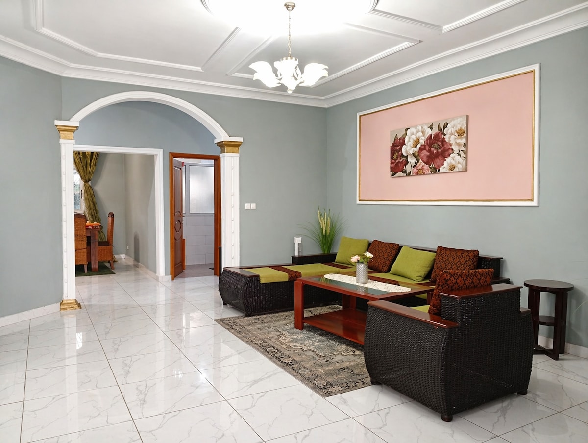 Experience resort-style living at Brillasol’s 5-bedroom villa, just minutes from La Lobé Waterfalls in Kribi. Enjoy a large private pool with sun loungers, shaded pergola, and outdoor dining area overlooking lush greenery for the perfect tropical escape. Inside, marble-style floors, designer lighting, and comfortable leather sofas create a modern lounge, while five elegant bedrooms with quality bedding and rainfall-shower bathrooms offer hotel-level comfort for families and groups.