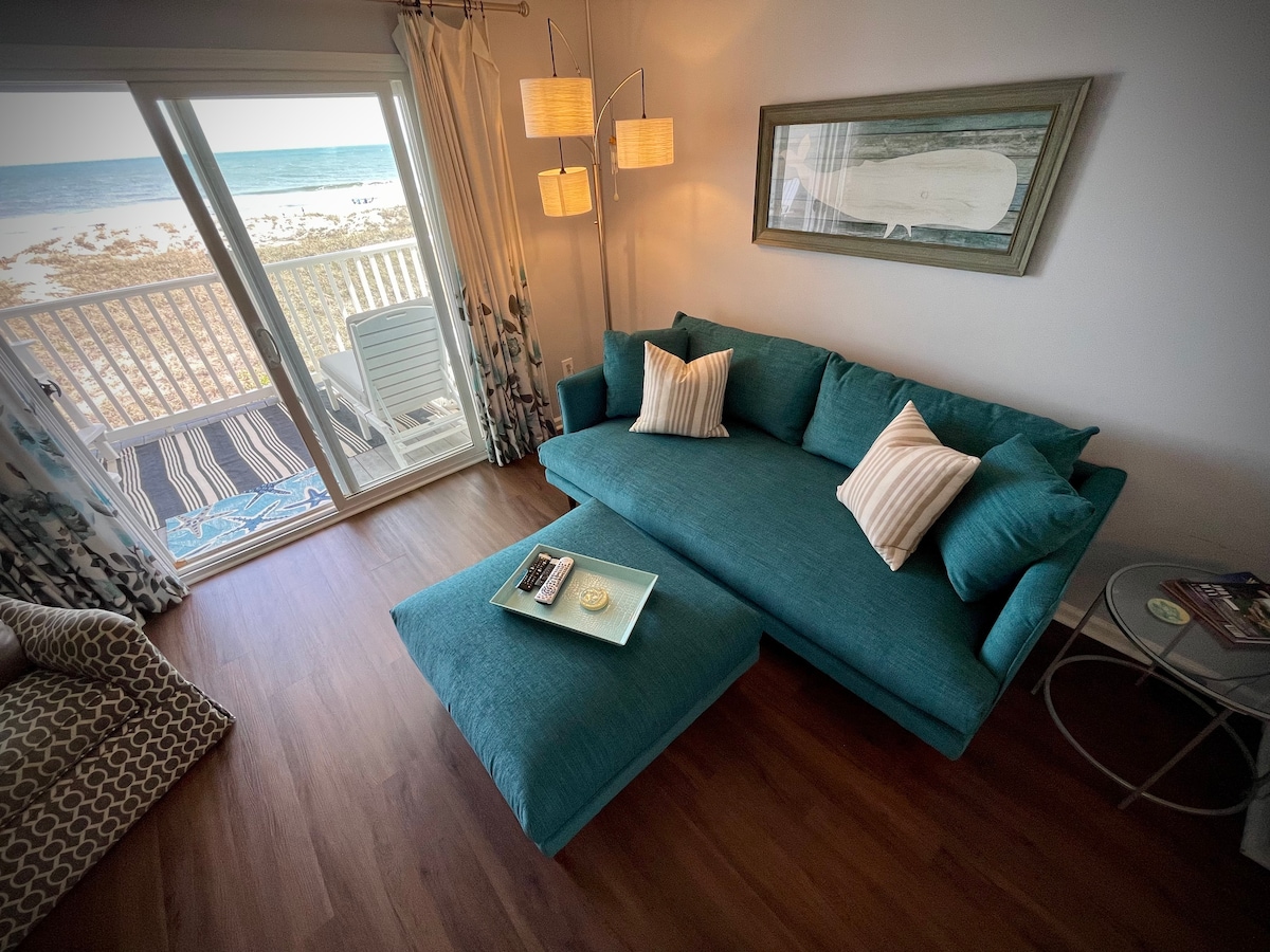 Ti diamo il benvenuto alle Surfs Edge Villas! Questo luminoso e intimo appartamento offre una splendida vista panoramica sull'oceano. Il rifugio personale fronte oceano, perfettamente posizionato a Carolina Beach, a pochi passi dal vivace centro della città, offre uno stile di vita costiero rilassato con accesso privato e facile alla sabbia e al surf e al parcheggio. Accogliente, caratteristico, pulito, personale rifugio sull'oceano! Rilassati sul balcone e osserva l'oceano che cambia in ogni momento della giornata. Rilassati nelle aree soggiorno/sala da pranzo/cucina a pianta aperta Tutte con vista sull'oceano