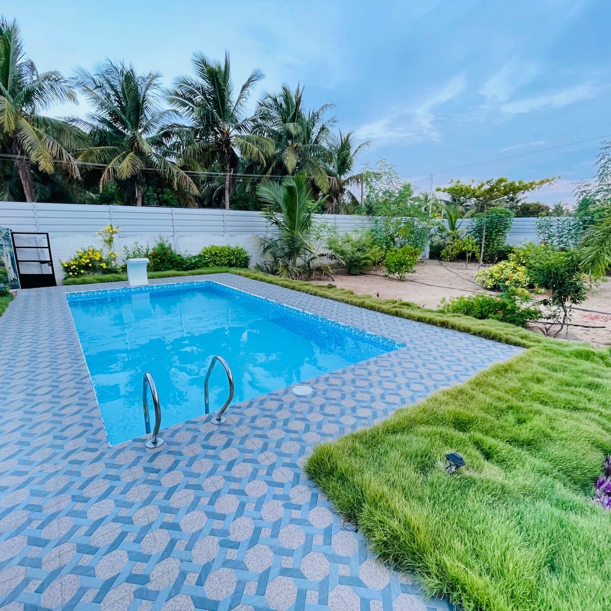 Just off the ECR Road on the beach side, located in a safe gated community, life feels easy - barefoot in the grass, cool morning air & the beach a 3-minute walk away. The villa & the garden are also quite spacious with 3 washrooms & enough space for 7 adults to comfortably sleep in. The house has books to read, games to play & a kids splash pool. Children love the space & solo travellers feel safe. There is also plenty to do nearby, with heritage sites & many eateries close at hand.