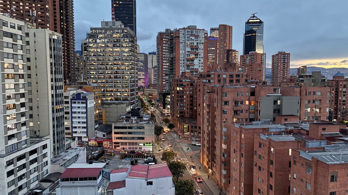 Piano 22, vista spettacolare, albe e tramonti. Confortevole appartamento nuovo tipo loft. Superhost. Situato nel Centro Internazionale e Storico di Bogotá. Ideale per soggiorni lunghi, lavoro, nomadi digitali, riposo, turismo, piacere. Internet 500 MB alta velocità 5G, 2 Ultra wifi. Smart Tv. Netflix. YouTube. 2 scrivanie da lavoro. Supermercato molto vicino. A 20 minuti dall'aeroporto El Dorado. Piano 25: piscina riscaldata, jacuzzi, palestra, sauna. Macchina per il caffè, caffè fresco tutti i giorni! Barbecue Piano 18