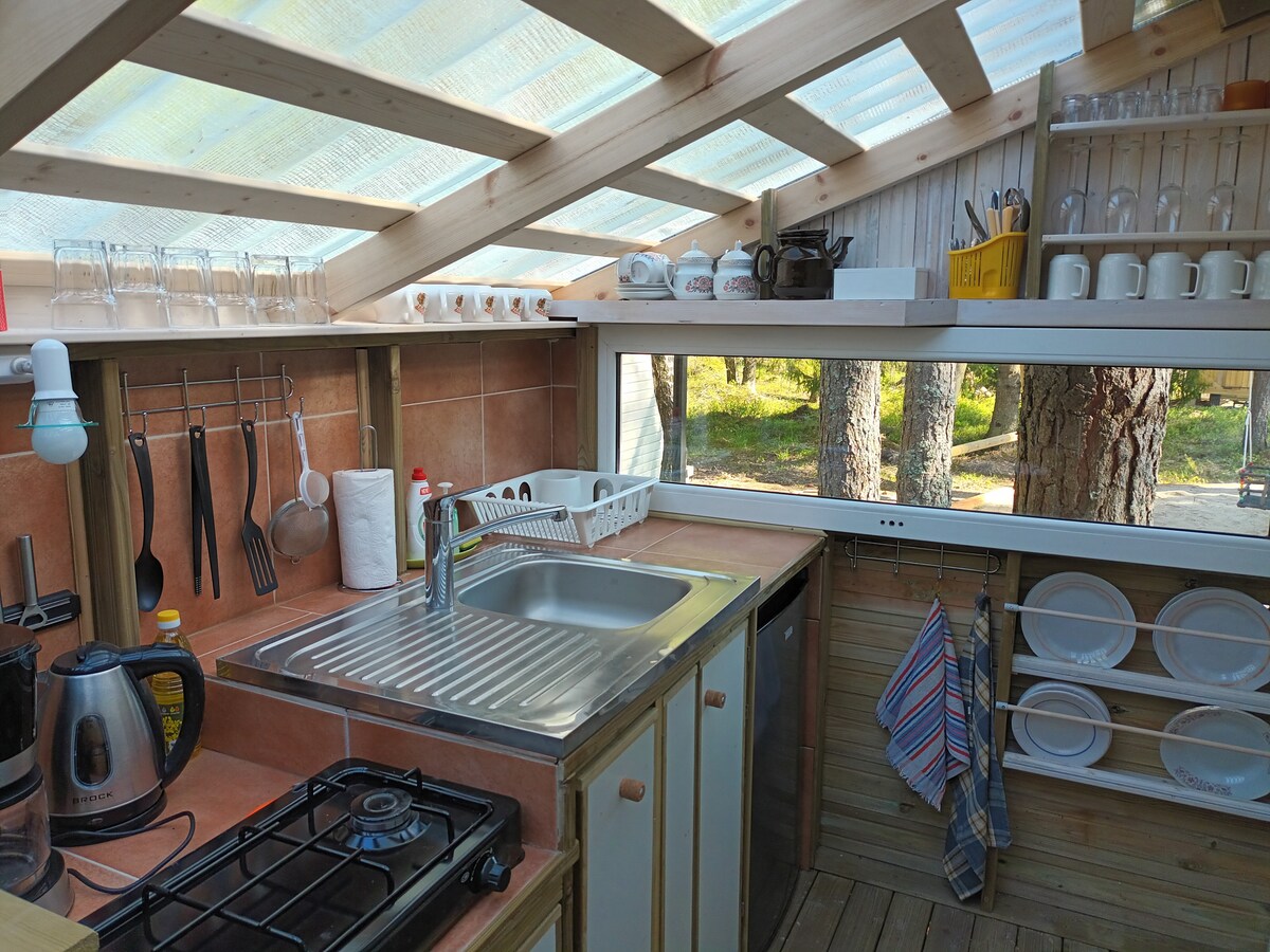 Goditi i servizi extra: vasca idromassaggio (39-59 €), sauna (30 €), cocktail bar, narghilè (20 €), tende sospese per un'esperienza di sonno unica (15 €), roulotte per escursioni e prodotti freschi di stagione. L'accogliente cabina può ospitare 4 persone (letto matrimoniale 120 cm + divano letto), materasso extra per il 5° ospite. L'angolo cottura include gli elementi essenziali per cucinare, caffè e spezie. Camino e pompa di calore ad aria (AC) per un comfort extra.