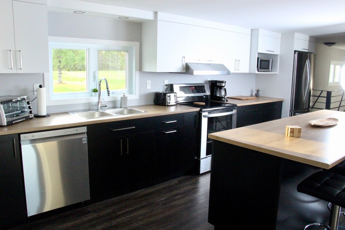 Completamente attrezzato. Ti piacerà sicuramente! All'esterno troverai un ampio patio, un barbecue e un caminetto all'esterno e all'interno. A pochi passi troverai diversi negozi, il molo e il minimarket River. In inverno, porta gli sci da fondo, i pattini e le ciaspole. Pista di pattinaggio nel villaggio, passeggiata sul lungomare ghiacciato CITQ: 295998