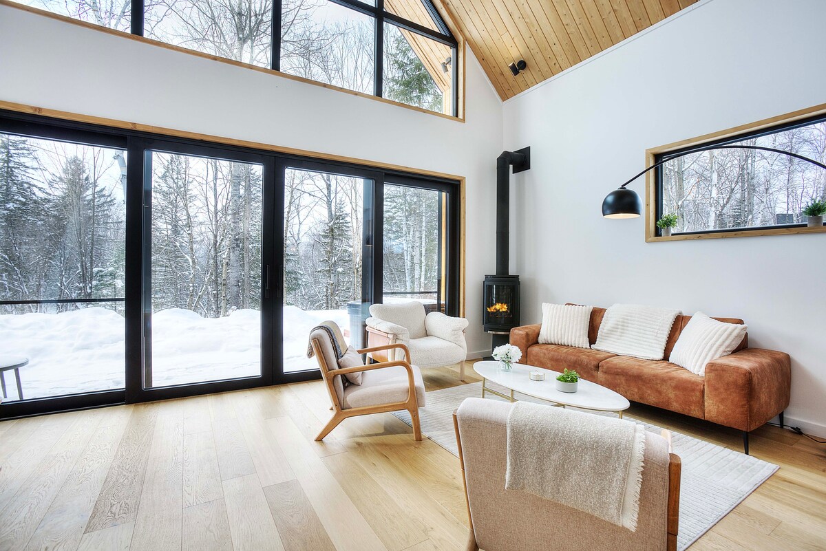★ One of the most unique chalets in Mont-Tremblant★ Unique & Secluded all White Glass Treehouse with Breathtaking Mont-Tremblant mountains views! The cabin is majestically glazed architectural space combining natural simplicity and contemporary luxury, 10 min from village of Mont-Tremblant, Ski Tremblant. Nestled on the end of the cliff with a fully glazed living space, Bathtub with view, The Panoramic terrace & Private hot tub for an unparalleled relaxation experience. Canadian Designer.