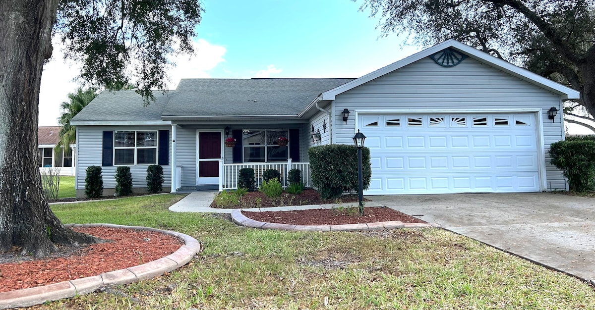 Bellissima casa in stile Monterey di 1600 piedi quadrati, 2 camere da letto/2 bagni, completamente arredata con una piscina riscaldata a 85° tutto l'anno. Ottima posizione a Rio Grande, a breve distanza in golf cart da Spanish Springs e Lake Sumter. La casa si trova in una tranquilla strada senza sbocco; non ci sono vicini dietro. Lanai privato dalla stanza Florida. Piani di lavoro in piastrelle e granito ovunque; elettrodomestici in acciaio inossidabile; divano letto nel soggiorno. Golf cart a benzina per 4 persone incluso. Spiacenti, vasca idromassaggio non inclusa. Cani ammessi! Smart TV in entrambe le camere da letto, TV via cavo solo nel soggiorno