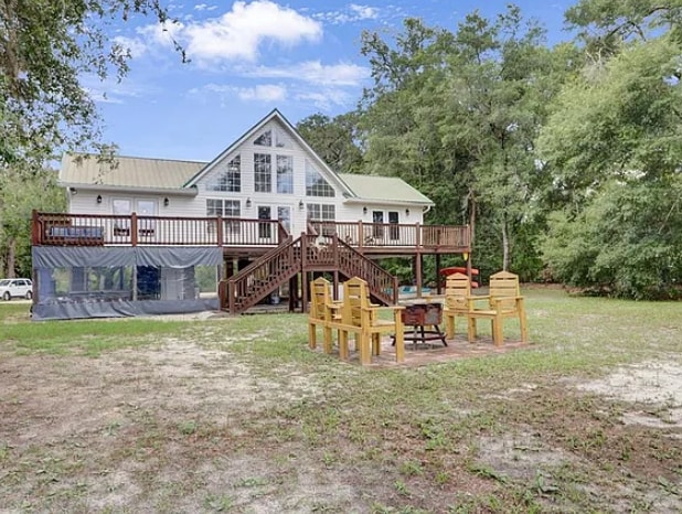Immersa nel cuore della Florida settentrionale rurale, questa pittoresca capanna di legno di 1,2 ettari offre un rifugio tranquillo circondato da maestose querce e imponenti pini. All'interno, gli ospiti sono accolti dal calore di un ambiente accogliente, dove arredi confortevoli invitano al relax. Tuttavia, il vero fascino risiede nell'ampia terrazza all'aperto, che invita gli ospiti a rilassarsi nella serenità della natura, sorseggiando la loro bevanda mattutina preferita tra una vasta selezione di caffè, tè e cioccolata calda.