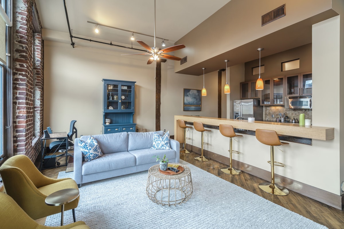 Benvenuti nel vostro elegante rifugio industriale nel cuore del centro di Knoxville! Questo splendido appartamento è la base perfetta per la tua avventura urbana, che unisce un design moderno a un'atmosfera accogliente e invitante. Entra e scopri lo spazio abitativo open space, con mattoni a vista, pavimenti in cemento lucido e soffitti alti. L'arredamento curato, i mobili e il letto king-size diviso per massaggi rendono questo il luogo ideale per rilassarsi dopo una giornata trascorsa a esplorare tutto ciò che Knoxville ha da offrire.