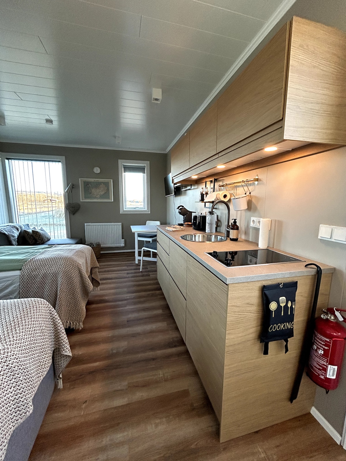 Cozy, minimalist 36 sqm mini Villa for max 2 persons (including children 0-13), only 2 km away from Fjaðrárgljúfur. The mini Villa has a stunning view of mountains and mossy lava field. Features a bedroom, modern bathroom with a shower, and a fully equipped kitchen with an oven/microwave, dishwasher, and a fridge. Enjoy your morning coffee from the Nespresso Citiz while soaking in the peaceful Icelandic landscape.