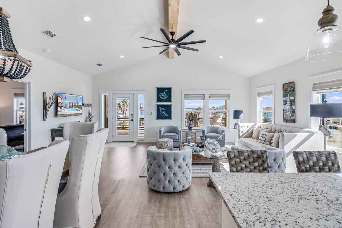 17 posti letto in questo fantastico luogo adatto alle famiglie! Vieni a rilassarti vicino alla PISCINA PRIVATA! 2 case, senza VICINI! 4 bagni completi e 3 cucine: la casa di 3 piani ha una suite principale con letto matrimoniale grande, una camera a castello con letto matrimoniale grande, un letto a castello e un letto singolo e il secondo piano ha un letto matrimoniale. Il cottage può ospitare 7 persone, con letto king-size, queen-size nel soppalco e divano letto. Soggiorna in questa bellezza della costa del Texas. VASCA IDROMASSAGGIO! Docce all'aperto vicino alla piscina e al garage per sciacquarsi dopo la spiaggia!