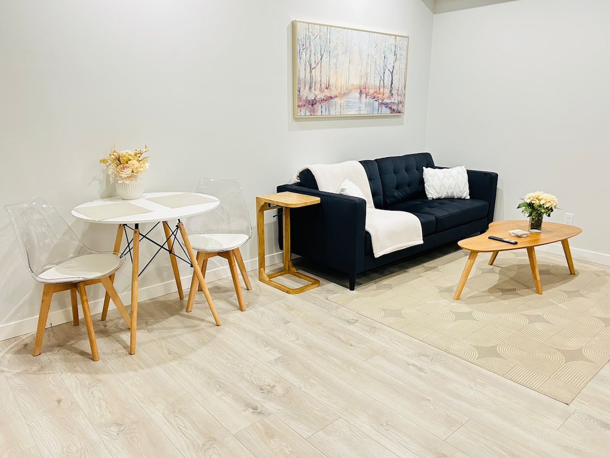 Enjoy private separate entry to this clean and well-appointed lower level one bedroom suite. Equipped kitchen, in-suite laundry, private parking and outdoor space. Ideal for longer stays, perfect for one or a couple. → Fully equipped kitchen with dishwasher, stove, microwave, etc. → Cozy bedroom with Serta queen mattress → Gas fireplace, open concept living, TV → Work space + wi-fi → Spacious 4pc bathroom → Laundry → Off-street parking Legal secondary suite has dedicated heat/ventilation.