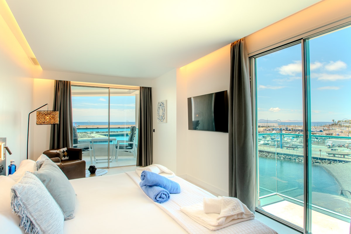 Habitación en suite situada en primera línea del paseo marítimo de Playa Blanca, (Isla de Lanzarote, Islas Canarias). Diseño moderno, con mucha iluminación y amplitud; Se distribuye en un espacio totalmente diáfano que incluye: Vestidor, baño completo, pequeño office con: nevera, congelador y horno/microondas, escritorio, terraza con vistas al mar y a nuestra isla vecina (Fuerteventura) . Cuenta con aire acondicionado/ calefacción, WiFi gratuito, caja fuerte, y smart TV.