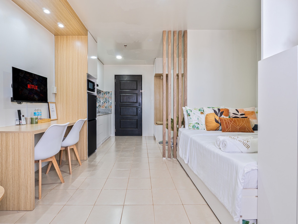 Resort like ambience Korean inspired design Brand New studio type condo with superb amenities. • 12th flr. w/ balcony view of CCLEX, City Skylines, mountain and sea • Double bed w/ pullout hotel like mattress and pillow with protectors lamp shade • Dining Area/Washing Machine • 214 MBPS wifi, TV 50 inches 4K HD signed in Netflix • Kitchen Area with basic cooking wares & appliances • Free use of 2 Olympic size Swimming Pool and a Kiddie pool • Smart Lock Check-in • Elevator
