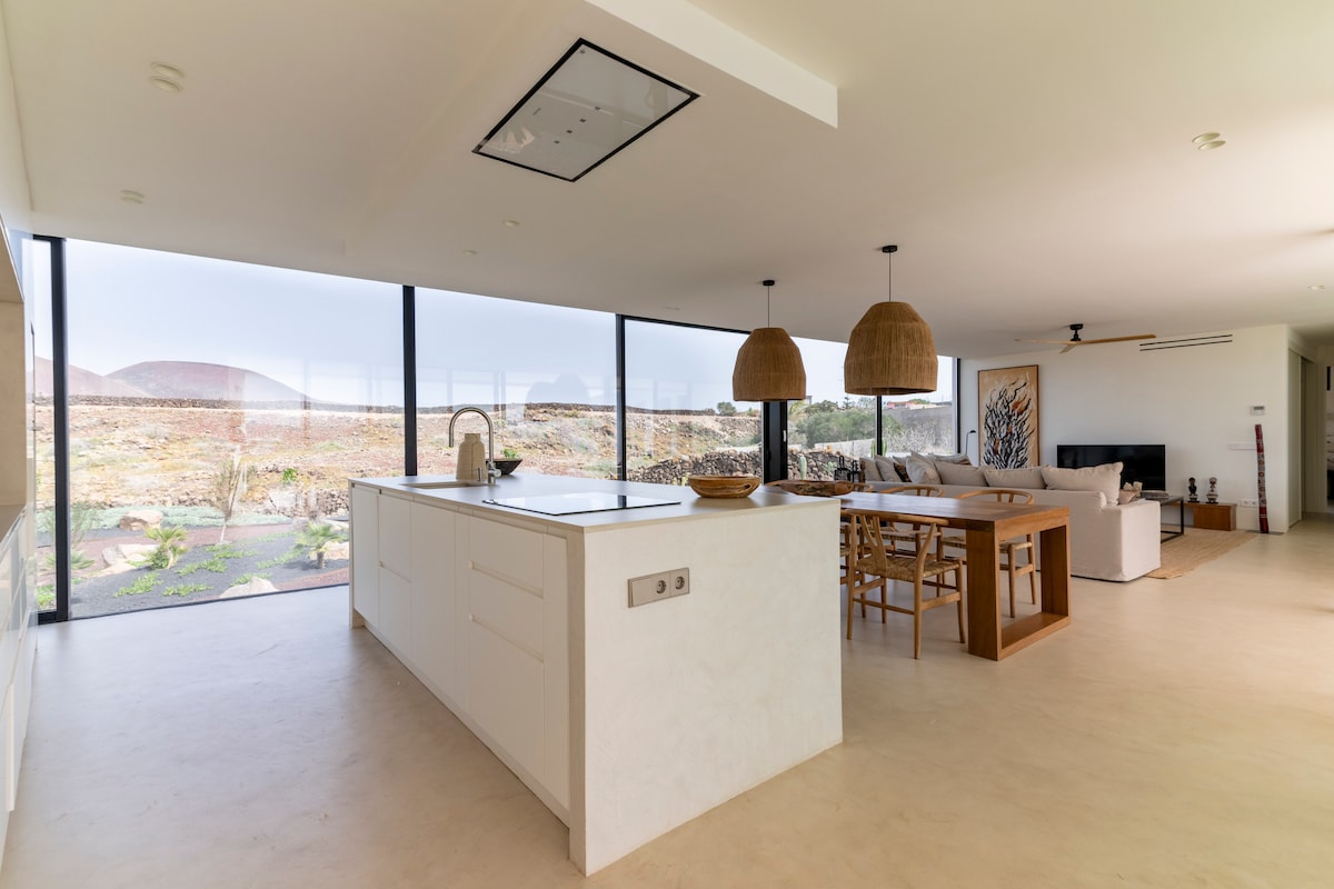 Situato in una zona esclusiva di Lajares, proprio sotto il vulcano "Calderón Hondo". La casa è composta da due camere da letto, un bagno comunicante, servizi igienici, ripostiglio, cucina, soggiorno. Ponte in legno con doccia esterna e piscina riscaldata (6 x 2,5 m). Design minimalista con vetri estesi che offrono splendide viste su uno dei paesaggi più belli del nord di Fuerteventura.