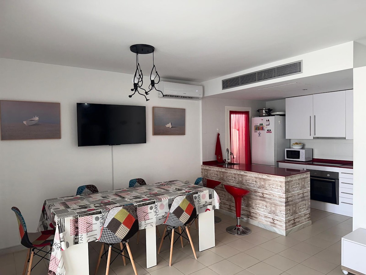 Appartamento sulla spiaggia con vista sul mare a Las Negras, Parco Naturale di Cabo de Gata, Almería. Molto vicino alla città e alla spiaggia. Aria condizionata e cucina con tutti gli accessori. C'è una piscina e un campo da SUP, nonché un garage chiuso e coperto.